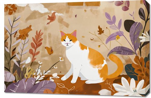 Obraz z serii abstrakcja zatytułowany Pospolita Krasa. Prezentuje on biało-rudego kota o bystrym spojrzeniu, wtapiającego się w pastelowy krajobraz pełen delikatnych kwiatów i latających ptaków. Jego łagodna postawa i miękkość linii kontrastują z żywiołowym tłem, dodając mu charakteru i głębi. Scena ta sprawdzi się w przestrzeniach, gdzie chcemy dodać odrobiny spokoju i natury, jak salony, pokoje relaksu, a także jako element dekoracyjny w klinikach weterynaryjnych lub sklepach zoologicznych, podkreślając bliskość ze światem zwierząt.