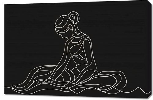 Obraz z serii wnętrza zatytułowany Pozycja Siedząca. Przedstawia minimalistyczny, linearny rysunek kobiety w pozycji siedzącej, wykonany białą linią na ciemnym tle. Praca artystyczna charakteryzuje się prostotą i elegancją, z postacią zredukowaną do serii płynnych, ciągłych linii, które tworzą zarówno kontury zewnętrzne, jak i subtelne detale ciała i stroju. Delikatny gęstwin linii w dolnej części obrazu sugeruje fałdy tkaniny, dodając wrażenia głębi i miękkości do kompozycji. Postać kobiety, z głową lekko pochyloną w dół, wyraża spokój i kontemplację. Obraz ten, z jego czystymi liniami i zrelaksowanym motywem, może wprowadzić atmosferę spokoju i wyciszenia do każdego nowoczesnego wnętrza, nadając mu jednocześnie artystycznego charakteru.