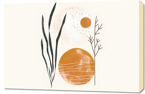 Obraz z serii wnętrza zatytułowany Przebłysk. Obraz prezentuje abstrakcyjną kompozycję o spokojnej, naturalnej kolorystyce, z dominującymi odcieniami beżu, pomarańczu i czerni. Centralne miejsce zajmują dwa okręgi, które mogą symbolizować słońce i księżyc lub inne astronomiczne ciała, z subtelnymi detalami przypominającymi krążki planetarne lub satelity. Obok nich znajdują się stylizowane rośliny lub trawy, które swoją smukłą formą i ciemnym kolorem tworzą kontrast wobec jaśniejszego tła. Dodatkowy element graficzny w postaci gałęzi z prostymi liniami przypomina drzewo lub krzew, dodając kompozycji organicznego charakteru. Całość jest utrzymana w stylistyce minimalizmu, z delikatnymi teksturami i rozpryskami, które nadają dziełu lekkości i nowoczesnego wyglądu. Ograniczona paleta barw oraz proste formy sugerują spokój i harmonię, co czyni obraz odpowiednim dla przestrzeni, które mają za zadanie inspirować do wyciszenia i refleksji.