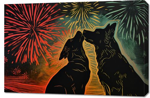 Obraz z serii abstrakcja zatytułowany Psi Uścisk. Przedstawia on dwie sylwetki psów, które wydają się być zwrócone ku sobie w gest podobny do uścisku, na tle intensywnie kolorowego nieba z fajerwerkami. Barwy od czerwieni po żółcie i zielenie tworzą tło, które wygląda jak nocne niebo w trakcie świętowania. Styl graficzny jest dynamiczny i pełen energii, a linie tworzące sylwetki psów są płynne i wyraziste. Ten obraz wyraża radość i nieodłączną więź pomiędzy zwierzętami, będąc doskonałym dodatkiem do wnętrz, gdzie chcemy podkreślić ciepło i pozytywne emocje.