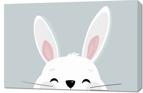 Obraz z serii wnętrza zatytułowany Radosne Skoki i przedstawia uroczy, radosny obraz króliczka, którego twarz wygląda spod górnego krawędzia obrazu. Jego wielkie, miękkie uszy w delikatnych odcieniach różu rzucają się w oczy na tle spokojnej, pastelowej szarości. Uśmiechające się zwierzątko, ze szczęśliwymi, zamkniętymi oczami, przywołuje atmosferę spokoju i radości. Idealny do pokojów dziecięcych lub jako przytulny akcent w kawiarniach i sklepach z artykułami dla dzieci. Jego subtelny, ale pełen ciepła charakter może również wprowadzić odrobinę uroku do każdej przestrzeni, która potrzebuje kropli niewinności i spokoju.