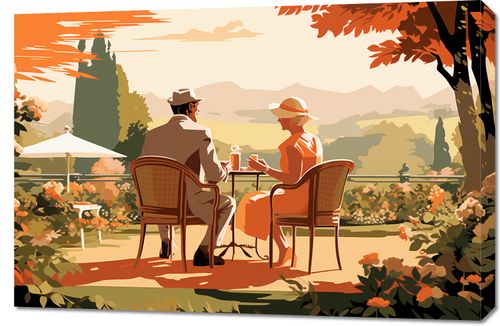 Obraz z serii abstrakcja zatytułowany Retro Randka, który przenosi nas w czasie do epoki art déco, gdzie elegancka para delektuje się popołudniową herbatą w zaciszu kwitnącego ogrodu. Ciepłe odcienie zachodzącego słońca tworzą romantyczną atmosferę, a stylizowana grafika podkreśla elegancję i wyrafinowanie epoki. Sylwetki postaci w modnych strojach tamtych lat oddają ducha minionych, beztroskich dni. Tło z rozległym widokiem na pagórkowate pejzaże i subtelnie zarysowane rośliny dodaje kompozycji głębi i spokoju. Ten obraz jest idealnym akcentem dla wnętrz inspirowanych vintage, dodając im klasy i nostalgii za światem sprzed lat.