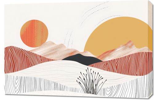 Obraz z serii boho zatytułowany Roztańczone Słońce. Obraz przedstawia abstrakcyjny pejzaż, w którym harmonia form i kolorów tworzy obraz pełen spokoju i równowagi. Jego głównymi elementami są stylizowane wzgórza, które płynnie przechodzą w miękkie linie, oraz dwa słońca, które swymi barwami ożywiają całą kompozycję. Delikatna roślinność w przedniej części dodaje głębi i tekstury, a zabawa cieniem i światłem wydobywa z obrazu uczucie ciepła.Ten obraz będzie doskonałym dodatkiem do wnętrz, gdzie pragnie się stworzyć atmosferę spokoju i odpoczynku, takich jak salony, gabinety lub pokoje gościnne. Jego subtelne barwy i proste formy wprowadzą do każdej przestrzeni odrobinę natury i ciepła.