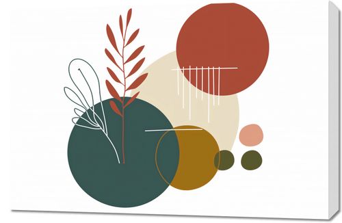 Obraz z serii minimalistyczne zatytułowany Rytm Warkotu. Ta grafika przedstawia stylizowane rośliny w ciepłych odcieniach czerwieni i zieleni, kontrastujące z geometrycznymi kształtami kół w spokojnych barwach beżu, żółci i głębokiej zieleni. Linie pionowe, wydające się być jak deszcz, dodają dynamiki i lekkości kompozycji.Ten obraz będzie się pięknie prezentować w przestrzeniach, które celebrują spokój i naturę. Doskonale wpasuje się w estetykę zen, ekologicznych wnętrz, czy w każdym pomieszczeniu, które ma na celu wprowadzenie elementów natury do domowego otoczenia. Będzie to świetny wybór dla tych, którzy szukają dekoracji ściennych do jasnych, przestronnych pomieszczeń, takich jak salony, jadalnie czy przestrzenie do medytacji.