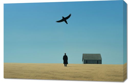 Obraz z serii abstrakcja zatytułowany Samotny i Wolny. Ten spokojny obraz prezentuje postać stojącą na rozległym polu, zwróconą w stronę małego domu i latającego wysoko ptaka. Kompozycja wyróżnia się prostotą i czystością linii, a jej ograniczona paleta barw - złocistych traw, jasnoniebieskiego nieba i ciemnych sylwetek - przyciąga uwagę i wywołuje uczucie spokoju. Obraz symbolizuje kontrast między uczuciem izolacji a pragnieniem wolności, co może być interpretowane na wiele sposobów. Idealny do przestrzeni, które cenią sobie spokój i refleksję, takich jak pokoje do medytacji, minimalistyczne salony, czy współczesne gabinety.