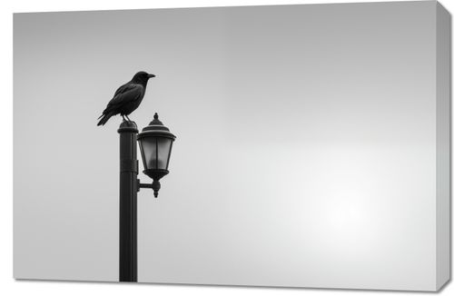 Obraz z serii wnętrza zatytułowany Samotny Postój Kruka. Prezentuje on sylwetkę kruka spoczywającego na klasycznej latarni ulicznej, uchwyconą w monochromatycznej palecie szarości. Ten spokojny, lecz sugestywny obraz jest symbolem refleksji i tajemnicy, doskonale wpisując się w klimat współczesnych przestrzeni miejskich. Praca ta z pewnością stanie się wyrazistym dodatkiem do nowoczesnych wnętrz, takich jak lofty czy minimalistyczne salony, a także wniesie element zastanowienia do przestrzeni publicznych takich jak galerie, kawiarnie i biblioteki, gdzie odosobnienie miesza się z miejskim zgiełkiem.