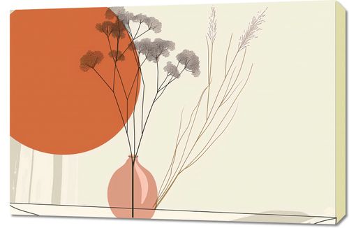 Obraz z serii boho zatytułowany Suszony Widok. Obraz ukazuje zgeometryzowane, stylizowane kwiaty suszonych roślin w wazonie na tle dużego, okrągłego słońca w ciepłych odcieniach pomarańczy i beżu. Kompozycja, w której dominują spokojne, jesiennie nastroje, łączy prostotę formy z bogactwem faktury. Obraz ten doskonale odnajdzie się w wnętrzach o prostym, lecz eleganckim wystroju, takich jak minimalistyczne salony, jadalnie czy hol. Idealnie wpasuje się w otoczenie zarówno nowoczesne, jak i te z nutą retro, wprowadzając ciepło i artystyczną, subtelność.