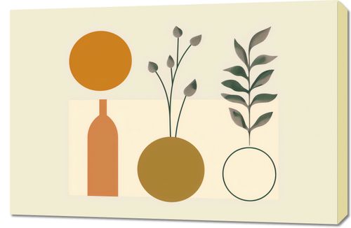 Obraz z serii boho zatytułowany Symfonia Równowagi. Obraz łączy organiczne kształty roślin z rygorystyczną formą geometrii. Prezentuje on wazony w spokojnych odcieniach brązu i złota, z których jeden jest ozdobiony gałązkami z delikatnymi pąkami, a drugi pokazuje symetryczny wzór liści. Proste linie i figury geometryczne, takie jak okrąg i prostokąt, tworzą tło dla roślinności, przypominając o ludzkiej próbie ujarzmienia natury. Całość osadzona na pastelowym tle wywołuje uczucie spokoju i harmonii. To dzieło będzie pasowało do przestrzeni, które cenią równowagę między naturą a stworzonym przez człowieka porządkiem, jak eleganckie gabinety, przestrzenie wellness lub strefy odpoczynku, które dążą do stworzenia oazy spokoju w zabieganym świecie.