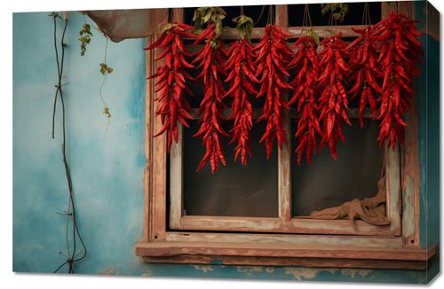 Plakat z serii wnętrza zatytułowany Szczypta Chilli - malowniczy obraz pełen kulturowego bogactwa, przedstawiający bujne kiście czerwonych papryczek chili, suszące się na drewnianej ramie okna. Kontrastujące kolory - żywe czerwienie chili na tle pastelowo-niebieskiej ściany - przyciągają wzrok i oddają esencję wiejskiego życia. Przytulne okno i zardzewiała siatka nadają scenie autentyczny, wiejski charakter, a delikatne odcienie i tekstury ściany dodają głębi i ciepła. Obraz ten jest hołdem dla prostoty i naturalnego piękna codziennego życia, idealnym do wnętrz, które pragną wnieść element tradycyjnego rzemiosła i natury.