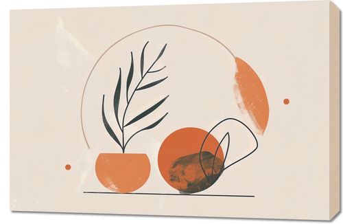 Obraz z serii boho zatytułowany Tonacja Pasteli. Obraz przedstawia harmonijną kompozycję elementów natury i abstrakcyjnych kształtów. Widzimy doniczkę z delikatną rośliną o czarnych, smukłych liściach, które delikatnie kontrastują z ciepłym odcieniem pomarańczy naczynia. Towarzyszą jej geometryczne formy: dwa krągłe kształty w tonacji ziemi, które przeplatają się, tworząc iluzję przestrzeni i głębi. Rysunek uzupełnia subtelna linia horyzontu i rozproszone kropki, dodające plakatowi dynamiki. Idealnie sprawdzi się jako element dekoracyjny w pomieszczeniach, gdzie dominuje spokój i równowaga, takich jak jasne, przestronne salony, pokoje do medytacji lub ciche zakątki bibliotek.