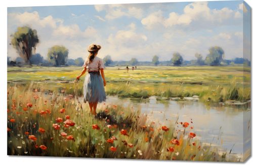 Obraz z serii pejzaże zatytułowany Wiejski Spokój. Przedstawia on kobietę w kapeluszu, stojącą na polu pełnym czerwonych maków, z zadumą spoglądającą w dal na rozległe, sielskie pejzaże. Jej postać, uchwycona od tyłu, emanuje spokojem i zamyśleniem, podkreślając intymny związek z naturą. Styl malarski obrazu, przypominający impresjonizm, z jego delikatnymi pociągnięciami i jasnymi barwami, sprawia, że scena jest zarówno realistyczna, jak i poetycka. Niebo jest przestronne i pełne lekkich chmur, co dodaje lekkości i przestronności. Ten obraz idealnie nadawałby się do dekoracji wnętrz, gdzie chcemy wprowadzić atmosferę spokoju i kontemplacji, takich jak salony, pokoje gościnne, gabinety terapeutyczne, a także przestrzenie użyteczności publicznej, które pragną stworzyć oazę wytchnienia dla swoich odwiedzających.