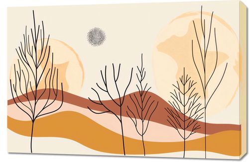 Obraz z serii boho zatytułowany Wydarta Pustynia. Przedstawia on abstrakcyjne, delikatne drzewa na tle pastelowych, organicznych kształtów i ciepłych odcieni zachodu słońca. Subtelna gra kolorów i tekstur tworzy wizję cichej, spokojnej przestrzeni. Różne odcienie i wielkości kolistych form mogą symbolizować słońca lub księżyce, dodając głębi i zainteresowania kompozycji. Ten obraz doskonale odnajdzie się w przestrzeniach, które cenią sobie spokój i harmonię. Jest idealny do dekoracji wnętrz, takich jak salon, sypialnia czy miejsce przeznaczone do medytacji i odpoczynku, oferując delikatne, lecz wyraziste akcenty kolorystyczne.