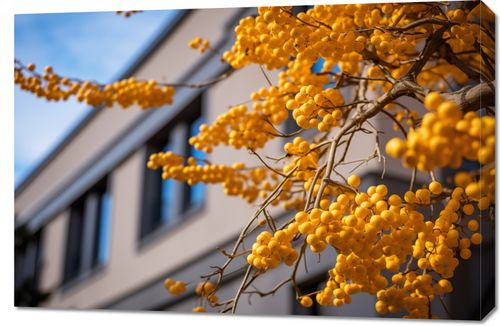 Obraz z serii natura zatytułowany Złote Jagody. Intensywnie żółte jagody na gałązce, w pełnym słońcu, z rozmytym tłem miejskiej architektury, przyciągają wzrok swoim żywym kolorem i naturalnym pięknem. Kontrast między organiczną formą jagód a geometrycznymi liniami budynku w tle tworzy współczesną kompozycję. Ten obraz wniesie do wnętrza odrobinę natury i koloru, doskonale nadając się do ożywienia przestrzeni biurowych, salonów, a także jako dekoracja w kawiarniach i restauracjach.