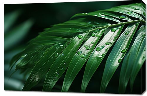 Obraz z serii natura zatytułowany Żywa Łagodność, przedstawia szczegółowe zbliżenie na liście palmy w odcieniach żywej zieleni, oświetlone promieniami słońca przenikającymi przez ich szpary. Gładkie i lśniące liście, z delikatnymi kroplami wody na ich powierzchni, tworzą poczucie ruchu i dynamiki, podczas gdy ich kontrastujące linie i formy wnoszą element struktury i elegancji. Delikatne światło i cienie na liściach, w połączeniu z bogatą paletą zieleni, wywołują uczucie spokoju oraz bliskości z naturą. Ta fotograficzna kompozycja mogłaby doskonale uzupełnić wnętrza, które cenią naturalność i organiczną estetykę, takie jak eko-salon, przestrzeń do jogi lub biura koncentrujące się na zrównoważonym rozwoju i ekologicznych inicjatywach.