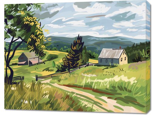 Obraz z serii pejzaże zatytułowany Bujna Wieś. Plakat przedstawia malowniczą scenę z wiejskiego krajobrazu, gdzie dominuje pastelowa paleta barw. W centralnym punkcie obrazu widzimy prostą, białą chłopską chatę z szarym dachem, otoczoną przez bujną, zieloną roślinność i rozległe pola. Drzewa z żółtymi akcentami wskazują na wczesną jesień, a ich rozmieszczenie i forma dają wrażenie naturalnego, rustykalnego otoczenia. Jasne, dynamiczne pociągnięcia pędzlem na niebie nadają scenie lekkości i ruchu, podczas gdy delikatnie zaznaczone wzgórza w tle oferują poczucie głębi i przestrzeni. Kolorystyka obrazu, łącząca ciepłe odcienie żółci z chłodnymi błękitami, przyciąga oko i sprawia, że scena jest zarówno spokojna, jak i energetyczna. Ta ilustracja może przywoływać uczucia nostalgii i spokoju, a także zachęcać do refleksji nad pięknem prostego życia na wsi.