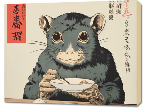 Obraz z serii motywy wschodnie zatytułowany Chwila Refleksji. Intrygujące spojrzenie gryzonia w tradycyjnym stroju, podkreślane przez błękitną tunikę i precyzyjne detale, które nadają mu humanoidalnego charakteru. Czerwone naczynia oraz kanji w tle kontrastują z jasnymi barwami obrazu, dodając nuty głębi i dziedzictwa kulturowego. Subtelna gra światła i cienia na stoliku z jedzeniem i napojem wzbogaca kompozycję i zachęca do refleksji nad połączeniem tradycji z nowoczesnością. Świetnie sprawdzi się w kawiarniach o azjatyckim klimacie, galeriach sztuki oraz w przestrzeniach dedykowanych kulturze Wschodu.