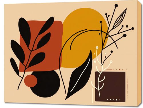 Plakat z serii minimalistyczne zatytułowany Ciepłe Kontury. Grafika przedstawia bogatą kompozycję stylizowanych roślin i abstrakcyjnych kształtów, utrzymaną w ciepłej palecie brązów, pomarańczy i ochry, z akcentami kontrastującej czerni. Delikatne linie dodają delikatności i subtelności, co sprawia, że praca emanuje naturalnym spokojem i elegancją. Obraz ten idealnie wkomponuje się w wnętrza, które cenią sobie ciepło i komfort, takie jak przytulne salony, jadalnie czy sypialnie. Dzięki swoim ziemistym tonom świetnie pasuje również do przestrzeni o naturalnym wystroju, wzbogacając je o elegancki, artystyczny akcent.
