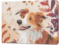 Obraz z serii wnętrza zatytułowany Collie Jesienną Porą. Na obrazie widnieje obraz psa rasy Border Collie, który z radością spogląda w bok, otoczony przez jesienne liście i gałązki, co oddaje sezonową zmianę i ciepło jesiennych kolorów. Psiak ma błyszczącą sierść w odcieniach bieli, karmelu i brązu, a jego uśmiechnięta mordka i łagodne oczy odzwierciedlają beztroski i radosny duch. Tło obrazu jest neutralne z akcentami czerwieni, pomarańczy i złota, co dodaje kompozycji życia i głębi. Ten plakat będzie idealnym dodatkiem do każdego wnętrza, szczególnie do pokojów dziecięcych, salonów lub kawiarni, oferując poczucie ciepła i spokoju, a także sprawdzi się jako prezent dla miłośników psów i miłośników przyrody.