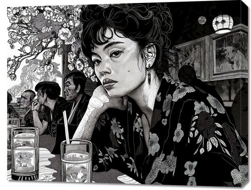 Obraz z serii motywy wschodnie zatytułowany Czarne Kimono. Przedstawia on czarno-białą scenę w restauracji, w której centralną postacią jest młoda kobieta o intensywnym spojrzeniu, ubrana w tradycyjny, kwiecisty kimono. Jej postać wyróżnia się na tle pozostałych gości, a szczegółowa grafika podkreśla wyraźne detale jej stroju i delikatnych rysów twarzy. Tło, zdobione motywem kwiatowym, nadaje głębi i kontekstu kulturowego, a całość kompozycji wywołuje atmosferę introspekcji i spokoju. Ten obraz idealnie nadaje się do wnętrz, które chcą oddać hołd klasycznej estetyce Dalekiego Wschodu lub po prostu wprowadzić element zastanowienia i piękna. Doskonale wpasuje się w przestrzenie takie jak salon, gabinet, a nawet miejsca publiczne, które pragną zapewnić swoim gościom wizualny odpoczynek i chwilę zadumy.