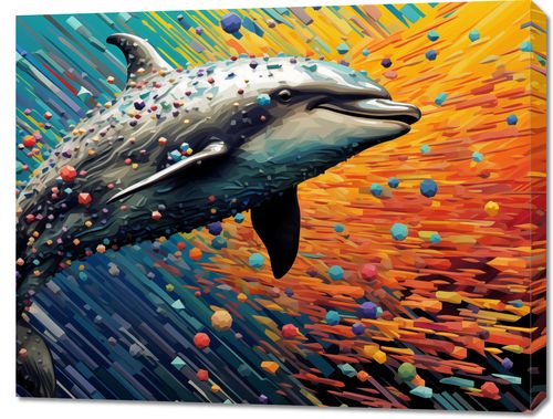 Obraz z serii pop art zatytułowany Delfin w Palecie Barw. Obraz prezentuje radosnego delfina wyskakującego z wody, z dynamicznie kolorowym tłem, które tworzy efekt rozpryskujących się kropli wodnych. Tło składa się z żywych pociągnięć pędzla w ciepłych odcieniach żółci, pomarańczy i chłodnych błękitów, co nadaje kompozycji wrażenie ruchu i witalności. Delfin jest oddany z dużym realizmem, z uwypukleniem szczegółów jego uśmiechniętej twarzy i skóry, natomiast abstrakcyjne, kolorowe kształty otaczające zwierzę nadają dziełu charakteru współczesnego dzieła sztuki. Obraz ten jest pełen pozytywnej energii i mógłby być pięknym, inspirującym dodatkiem do każdego środowiska, szczególnie tam, gdzie chciano by podkreślić miłość do oceanu, natury lub sztuki współczesnej.