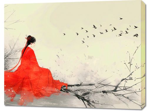 Obraz z serii motywy wschodnie zatytułowany Diva Na Gałęzi. Obraz przedstawia eteryczną scenę utrzymaną w delikatnej palecie barw z przewagą odcieni szarości i bieli, która kontrastuje z wyrazistą czerwienią. Na pierwszym planie widzimy postać kobiety w tradycyjnym, czerwonym stroju, z eleganckim uczesaniem i ozdobami we włosach, co sugeruje kulturalne lub historyczne znaczenie ubioru. Siedzi ona na gałęzi drzewa, a jej sukienka płynnie przechodzi w linie, które mogą symbolizować wiatr lub wodę, dodając grafice dynamiki. Tło jest stonowane i minimalistyczne, z subtelnymi plamami farby tworzącymi delikatną atmosferę. Nad sceną unosi się stado ptaków, które wzbija się do lotu, co może symbolizować wolność lub przejście. Całość kompozycji emanuje spokojem, melancholią i pięknem natury, a także może sugerować opowieść lub głębsze znaczenie skryte w postaci kobiety i jej połączeniu z otoczeniem.