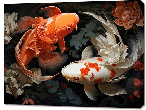 Obraz z serii motywy wschodnie zatytułowany Harmonijny Taniec to arcydzieło, które wyraża subtelność i równowagę przez harmonijne współistnienie natury i sztuki. Dwie ryby koi, jedna w odcieniach płomiennego pomarańczu, druga w pastelowych barwach kremu z akcentami czerwieni, są przedstawione w eleganckim tańcu, który jest tak płynny i gracji jak ruchy baletnicy. Ich delikatne płetwy przypominają falujące tkaniny, unoszące się w wodnym balecie, otoczone przez misternie malowane kwiaty, które dodają całości organicznej głębi. To zmysłowe i prowokujące do refleksji dzieło, które doskonale uzupełni każde wyrafinowane wnętrze, od stylowych kawiarni po intymne przestrzenie prywatne, gdzie design łączy się z naturalnym pięknem.