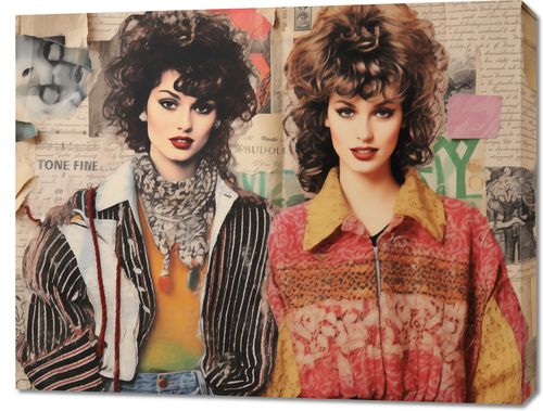 Obraz z serii pop art zatytułowany Ikony Stylu'80. Na tym nostalgicznie inspirowanym dziele sztuki widzimy dwie kobiety ubrane w odzież z lat 80., z charakterystycznymi, bujnymi fryzurami i wyrazistym makijażem. Ich postacie zostały umieszczone na tle kolażu z epoki, wypełnionego fragmentami starych gazet, ręcznych pism i ilustracji, co dodaje kontekstu historycznego i kulturowego. Silne kontrasty kolorystyczne i wyraźne linie twarzy podkreślają wyrazisty charakter obu postaci. Ten obraz to hołd dla mody i kultury lat 80., idealny dla przestrzeni, które pragną dodać retroflairu i odzwierciedlić ducha minionych dekad.