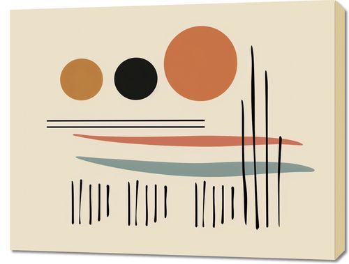 Obraz z serii boho zatytułowany Iluzja Horyzontu.Obraz to zestawienie geometrycznych kształtów i linii, które razem tworzą abstrakcyjny krajobraz. Okręgi w ciepłych odcieniach złota, pomarańcza i czerni sugerują wschodzące lub zachodzące słońce, a pionowe linie mogą przypominać wysokie trawy lub cienie drzew. Poziome pasy w różnych kolorach tworzą iluzję horyzontu, nadając kompozycji głębi i równowagi. Dzieło to wprowadzi do każdego wnętrza element spokoju i kontemplacji. Jest idealne dla przestrzeni, które cenią prostotę i abstrakcję, takich jak nowoczesne salony, minimalistyczne przestrzenie robocze, czy jako element dekoracyjny w pomieszczeniach oczekujących.