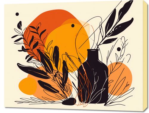 Obraz z serii minimalistyczne zatytułowany Jaskrawy Zachód. Na grafice widnieje silnie stylizowany motyw roślinny, gdzie czarne sylwetki roślin kontrastują z jaskrawo pomarańczowym i żółtym tłem, przypominającym zachodzące słońce. W tle pojawiają się delikatne, abstrakcyjne linie i kształty, dodające kompozycji głębi i tekstury.Ten plakat doskonale wpasuje się w wnętrza ożywione roślinnością, zarówno te domowe, jak i komercyjne przestrzenie typu kawiarnie lub sklepy z roślinami. Jego ciepłe barwy będą wprowadzać przytulną atmosferę i mogą stanowić żywy akcent w przestrzeniach utrzymanych w naturalnej kolorystyce.