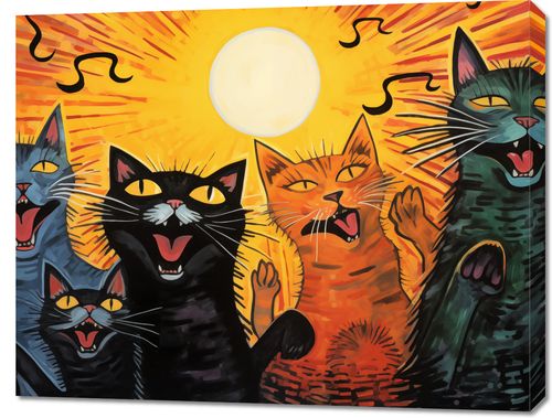 Obraz z serii abstrakcja, zatytułowany Kocie Koncertowanie. Ta dynamiczna i zabawna ilustracja przedstawia grupę kotów, które z entuzjazmem śpiewają lub miauczą w towarzystwie wschodzącego słońca, tworząc poczucie ruchu i życia. Intensywne kolory, wyraziste linie i humorystyczne wyraz twarzy kotów sprawiają, że dzieło to jest pełne energii i charakteru. Obraz jest idealnym dodatkiem do każdego pomieszczenia, szczególnie tam, gdzie chcemy dodać odrobiny ciepła, humoru i barw. Świetnie sprawdzi się w pomieszczeniach wspólnych, pokojach dziecięcych, a także w przestrzeniach kreatywnych lub jako prezent dla miłośników kotów.