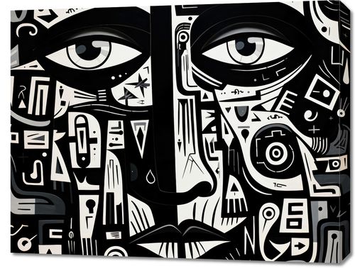 Obraz z serii abstrakcja zatytułowany Labirynt Myśli. Intrygujące oczy spoglądające z głębi obrazu są otoczone złożonymi wzorami i symbolami, które łączą się, tworząc enigmatyczny portret. Czarno-białe barwy kontrastują ze sobą, dodając dziełu intensywności i głębi. Złożoność wzorów symbolizuje skomplikowane myśli i emocje, które kryją się za ludzkim spojrzeniem. Świetnie sprawdzi się w nowoczesnych biurach, galeriach sztuki oraz w przestrzeniach przeznaczonych dla miłośników abstrakcyjnej ekspresji.
