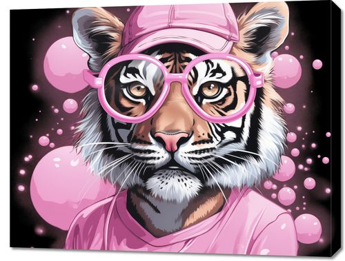 Obraz z serii pop art Ludzki Tygrys. Na obrazie widzimy głowę tygrysa, który jest ubrany w stylizowany, ludzki sposób. Tygrys ma na sobie różową czapkę z daszkiem oraz okulary w tym samym kolorze, co dodaje mu ludzkiego charakteru. Tło obrazu jest proste, pokryte bąbelkami w różnych odcieniach różu, co tworzy zabawny i lekko surrealistyczny klimat. Ten kolorowy i kreatywny projekt może przyciągnąć uwagę w różnorodnych przestrzeniach, od młodzieżowych pokoi po galerie sztuki. Jest to doskonały przykład współczesnego połączenia natury i kultury pop, który może być tematem rozmów i oryginalnym elementem dekoracyjnym.
