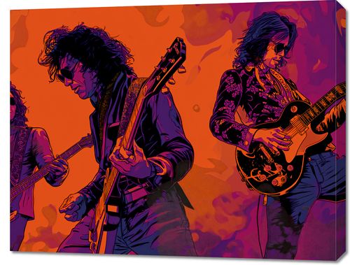 Obraz z serii pop art zatytułowany Mamy To Flow. Obrazuje trzech gitarzystów zanurzonych w pasji muzyki, z instrumentami w rękach, oddając ducha rock'n'rolla. Intensywne kolory, w tym głębokie odcienie pomarańczu i fioletu, tworzą tło, które pulsują energią i rytmem. Obraz oddaje esencję koncertowej atmosfery i jest hołdem dla klasycznych rockowych wirtuozów. Znakomicie wpasuje się w przestrzenie kulturalne, takie jak sale koncertowe, studia muzyczne, jak również jako żywiołowy akcent dekoracyjny w młodzieżowych pokojach czy salonach miłośników muzyki.