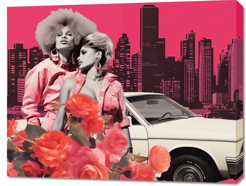 Obraz z serii pop art zatytułowany Metropolitalne Divy. Ta stylowa kompozycja łączy dynamikę miejskiego życia z vintage glamour, prezentując dwie kobiety w modnych strojach w tonacji różu, które emanują siłą i elegancją. Ich fryzury i dodatki nawiązują do lat 70. i 80., wprowadzając do obrazu powiew nostalgi. W tle widoczne są charakterystyczne dla wielkiego miasta sylwetki drapaczy chmur, wszystko utrzymane w wyrazistej, różowej kolorystyce, która nadaje plakatowi wyjątkowego charakteru. Na pierwszym planie, między postaciami, widnieje klasyczny samochód i bujny kwiat róż, dodający kompozycji romantycznej aury. Idealny dla wnętrz inspirowanych modą retro oraz dla miłośników miejskiego sznytu.