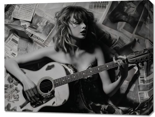 Obraz z serii pop art zatytułowany Młoda Gitarzystka. Portretuje młodą, energiczną gitarzystkę, zanurzoną w muzyce, otoczoną przez rozrzucone gazety. W monochromatycznej palecie szarości, uchwycono moment twórczego uniesienia artystki, jej pasję i pochłonięcie sztuką. W tle obrazu, strzępy artykułów i notatek muzycznych dodają głębi i kontekstu, sugerując bogatą historię i inspiracje. Obraz idealnie nadaje się do wnętrz vintage, studiów muzycznych, jak również jako inspirujący element w pokojach młodych twórców i wszędzie tam, gdzie chcemy podkreślić miłość do muzyki i jej uniwersalne przesłanie.