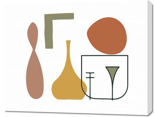Obraz z serii boho zatytułowany Naczynia. Obraz prezentuje kolekcję abstrakcyjnych form, które przypominają różne przedmioty od naczyń po elementy dekoracyjne, tworząc estetyczną mieszankę linii i kształtów. Zestawienie spokojnych, pastelowych barw z silnymi, geometrycznymi figurami tworzy wizualnie przyjemną kompozycję, która zwraca uwagę swoją subtelną elegancją. To dzieło artystyczne jest doskonałym wyborem dla wnętrz o nowoczesnym designie, w których chcemy wprowadzić sztukę bez dominujących nad przestrzenią. Idealnie sprawdzi się jako delikatny akcent w przestronnym salonie, biurze czy jako część galerii w domowym korytarzu.