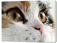 Obraz z serii abstrakcja zatytułowany Niktowany Kot. Ukazuje zbliżenie na twarz kota, wykonane z niezwykłą dbałością o detale, co sprawia wrażenie trójwymiarowości. Całość jest utrzymana w technice przypominającej szycie lub haft, gdzie każda nitka została precyzyjnie ułożona, aby naśladować naturalne linie futra. Olśniewające, złote oczy kota są pełne wyrazu i życia, przyciągają uwagę i są centralnym punktem kompozycji. Złożone z wielu warstw i kolorów linie tworzą dynamiczną i niemal hipnotyzującą teksturę. Obraz ten byłby doskonałym wyborem dla miłośników sztuki i zwierząt, wnosząc element elegancji i oryginalności do każdego wnętrza.