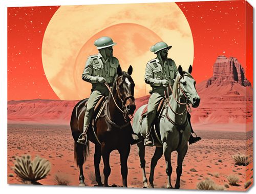 Obraz z serii pop art zatytułowany Patrol Kosmiczny. Przedstawia on dwóch żołnierzy w historycznych mundurach na koniach, umieszczonych w futurystycznym, marsjańskim krajobrazie. Czerwonawe odcienie terenu i ogromne, żółte słońce na tle czerwonego nieba nadają scenie poczucie surrealistycznej podróży w czasie. Sylwetki koni i postaci wydają się być zaczerpnięte prosto z klasyki westernu, ale kontekst kosmiczny sugeruje odległe galaktyki. Ta niezwykła kombinacja elementów tworzy odważny i pomysłowy komentarz na temat historii i przyszłości eksploracji, idealnie pasując do przestrzeni, które cenią sobie kreatywność i odwagę w sztuce. Idealny do nowoczesnych wnętrz jak i tych z branży kreatywnej.