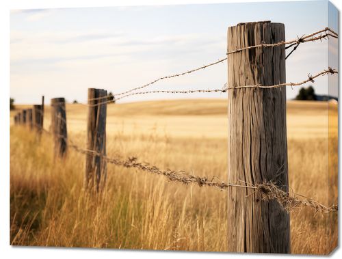 Obraz z serii pejzaże zatytułowany Płot na Polu. Obraz przedstawia rustykalny drewniany płot z drutem kolczastym, ciągnący się wzdłuż złocistego, zbożowego pola. Delikatne odcienie złota i brązu, w połączeniu z subtelnie rozmytym tłem, tworzą poczucie głębi i przestrzeni. Ten spokojny, wiejski krajobraz wprowadza atmosferę relaksu i odprężenia, idealnie nadając się do wnętrz inspirowanych naturą lub jako ukojenie dla zaganianych mieszkańców miast. Doskonały do salonu, jadalni lub jako element wypoczynkowej przestrzeni.