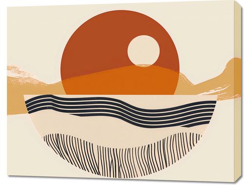 Obraz z serii boho zatytułowany Pół na Całość. Obraz przedstawia uproszczony, geometryczny krajobraz, w którym słońce jest głównym bohaterem, stanowiąc centralny punkt kompozycji. Jego okrągły kształt dominuje na tle abstrakcyjnych wzgórz i falujących linii, które mogą przypominać wzburzone morze lub piaszczyste wydmy. Kolorystyka plakatu to spokojna paleta ciepłych odcieni pomarańczu, beżu i czerni, która nadaje dziełu głębi i kontrastu.Ten obraz będzie wspaniałym dodatkiem do wnętrz urządzonych w ciepłych, ziemistych barwach, gdzie może dodać nowoczesnego charakteru. Idealnie sprawdzi się jako punkt centralny w przestrzeniach, które korzystają z naturalnego światła, takich jak salony, gabinety czy przestronne hole.