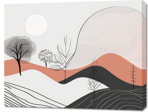 Obraz z serii boho zatytułowany Półcień Widoku.Obraz przedstawia oniryczny pejzaż, gdzie delikatne linie drzew przenikają przez łagodne, faliste wzgórza. Ciepłe odcienie czerwieni i różu przeplatają się z chłodniejszymi szarościami i czernią, tworząc poczucie głębi i spokoju. Subtelna tekstura na niektórych elementach dodaje wrażenia ruchu, a biała sfera w tle przywołuje skojarzenia z pełnią księżyca lub wschodzącym słońcem. Dzieło idealnie wpasuje się w wnętrza o spokojnym charakterze, takie jak stylowe sypialnie, czytelnie lub pokoje relaksacyjne. Może również przynieść element ukojenia i inspiracji do przestrzeni współpracujących, zapewniając wizualną odskocznię od codzienności. Zapewni miękki kontrast we wnętrzach urządzonych w naturalnych materiałach i odcieniach.