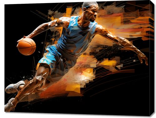 Obraz z serii abstrakcja zatytułowany Przełomowy Drybling. Na tym dynamicznym obrazie sportowiec w akcji wykonuje widowiskowy manewr na boisku do koszykówki. Jego sylwetka, uchwycona w pełnym ruchu, jest stylizowana na kolaż geometrycznych kształtów i energetycznych pociągnięć, które tworzą wrażenie szybkości i mocy. Kontrastujące, ciepłe barwy podkreślają ekspresję i intensywność momentu, a złamane linie i rozbryzgi dodają wizualnego napięcia. Ten obraz to hołd dla pasji i emocji towarzyszących sportowej rywalizacji, idealny dla każdego miłośnika koszykówki i dynamicznego, współczesnego designu.