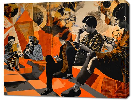 Obraz z serii pop art zatytułowany Przestrzeń Do Dialogu. Prezentuje grupę ludzi w stylizowanych retro ubraniach, zanurzonych w konwersacji i zatopionych w swoich myślach, co sugeruje głębię ludzkiego połączenia i introspekcji. Tło plakatu to geometryczne i abstrakcyjne formy w odcieniach pomarańczu, żółci i brązu, nawiązujące do lat 60. i 70. XX wieku, wprowadzając elementy vintage do nowoczesnej przestrzeni. Postacie wydają się pochłonięte rozmową, a ich pozy i gesty odzwierciedlają osobistą wymianę i komunikację. Obraz ten jest idealny do kawiarni, salonów, bibliotek, lub jako inspirujący akcent w domowych biurach, zachęcając do refleksji i twórczego dialogu.