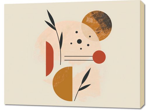 Obraz z serii boho zatytułowany Przyrost do Tła.Obraz przedstawia abstrakcyjną kompozycję złożoną z prostych, geometrycznych form i roślinnych motywów. Dominują tutaj ciepłe odcienie pomarańczowego, różu i brązu, które mieszają się z czernią i beżem. Na pierwszym planie mamy elementy roślinne, które mogą przypominać liście lub gałązki, zaś w tle znajdują się różnej wielkości i faktury koła. Całość jest stylizowana i uproszczona, co daje efekt współczesnego, designerskiego dzieła sztuki. Plakat może inspirować poczuciem spokoju i natury, jednocześnie zachowując modernistyczne uczucie. Idealnie wpasuje się w nowoczesne wnętrze jako centralny punkt dekoracyjny lub delikatne uzupełnienie estetyczne.