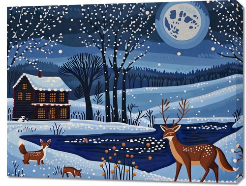 Obraz z serii abstrakcja zatytułowany Przyszła Zima. Obraz przedstawia malowniczą, zimową scenę w stylistyce folklorystycznej. Na obrazie dominują chłodne odcienie niebieskiego, tworząc nocny krajobraz pokryty śniegiem. Centralny motyw stanowi dom z oświetlonymi oknami, co nadaje scenie ciepły, przytulny akcent. Śnieg delikatnie opada na drzewa i dach domu, a pełnia księżyca rozświetla niebo, odbijając się w zamarzniętym strumieniu. Na pierwszym planie widać sylwetki zwierząt: dorosłego jelenia i młodego lisa, które dodają kompozycji naturalnego życia i ruchu. Tło przedstawia malownicze wzgórza i lasy, co współgra z idyllicznym, spokojnym nastrojem obrazu. Scena ta wywołuje uczucie spokoju i cichej radości, sprawiając, że plakat ten jest idealny do dekoracji wnętrz w zimowym okresie, dodając im ciepła i uroku.