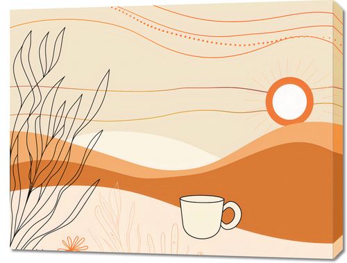 Obraz z serii minimalistyczne zatytułowany Ranna Pora. Obraz przedstawia stylizowany, spokojny krajobraz pustynny z wschodzącym słońcem, które emanuje ciepłem, barwiąc niebo w pastelowe odcienie. Ponad łagodnymi, falującymi wzgórzami widnieją delikatne linie, które mogą przypominać ciepłe prądy powietrza lub subtelne ozdoby. Na pierwszym planie znajduje się filiżanka kawy, umieszczona tak, jakby była częścią pustynnego terenu, co dodaje scenie element codziennego rytuału i spokoju. Obraz jest pełen ciepłych, ziemiście beżowych i pomarańczowych odcieni, które wprowadzają atmosferę relaksu i spokoju. Idealnie pasuje do przestrzeni wypoczynkowych, takich jak kawiarnie, salony, czy pokoje do odpoczynku, gdzie może pomóc stworzyć przytulne i spokojne otoczenie. Dzieło to z pewnością będzie przyciągać wzrok, będąc subtelny jednocześnie.