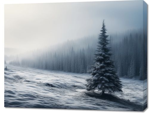 Obraz z serii pejzaże zatytułowany Samotna Choinka. Ta grafika ukazuje malowniczy, zimowy krajobraz z dominującą pojedynczą, okazałą choinką pokrytą śniegiem. Otoczona przez delikatnie zasnutej mgłą lasy, podkreśla spokój i majestatyczną ciszę zimy. Delikatne odcienie błękitu i bieli tworzą wrażenie chłodu i spokoju. Ten obraz będzie idealnym dodatkiem do każdego wnętrza, gdzie chcemy wprowadzić atmosferę spokoju i kontemplacji, świetnie sprawdzi się w przestrzeniach takich jak gabinety relaksacyjne, spa, a także jako element dekoracyjny w domowych salonach lub sypialniach.