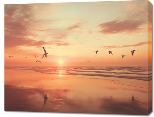 Obraz z serii pejzaże zatytułowany Spokojna Przystań przedstawia idylliczny wschód słońca nad morzem, gdzie złociste promienie światła tańczą po delikatnie falującej powierzchni wody. Sylwetki mew unoszących się na ciepłym powietrzu dodają uczucia wolności i bezkresu. Rozmyte odbicia ptaków na mokrym piasku nadmorskim wzbudzają uczucie spokoju i kontemplacji. Ten obraz jest kwintesencją ukojenia, idealny do wnętrz o tematyce nadmorskiej, czy to w prywatnych rezydencjach pragnących złapać oddech od miejskiego zgiełku, jak i w przestrzeniach wellness, spa, czy hotelowych lobby, gdzie głównym celem jest relaks i odprężenie.
