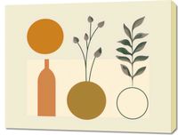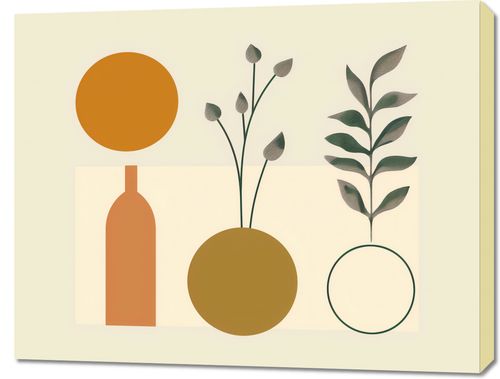 Obraz z serii boho zatytułowany Symfonia Równowagi. Obraz łączy organiczne kształty roślin z rygorystyczną formą geometrii. Prezentuje on wazony w spokojnych odcieniach brązu i złota, z których jeden jest ozdobiony gałązkami z delikatnymi pąkami, a drugi pokazuje symetryczny wzór liści. Proste linie i figury geometryczne, takie jak okrąg i prostokąt, tworzą tło dla roślinności, przypominając o ludzkiej próbie ujarzmienia natury. Całość osadzona na pastelowym tle wywołuje uczucie spokoju i harmonii. To dzieło będzie pasowało do przestrzeni, które cenią równowagę między naturą a stworzonym przez człowieka porządkiem, jak eleganckie gabinety, przestrzenie wellness lub strefy odpoczynku, które dążą do stworzenia oazy spokoju w zabieganym świecie.