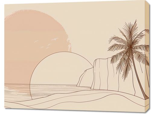 Obraz z serii minimalistyczne zatytułowany Szept Tropików. Plakat przedstawia delikatnie zarysowany krajobraz tropikalny o wschodzie lub zachodzie słońca. W centralnej części kompozycji widnieje wielki, ciepły dysk słońca, którego połowa chowa się za horyzontem. U jego podstawy majaczą delikatne linie morza, a na pierwszym planie z prawej strony wznosi się smukła palma o finezyjnie narysowanych liściach. Z lewej strony rysunek przedstawia wysokie klify, które wyłaniają się z morza, a na tle słońca można dostrzec lekkie sylwetki ptaków. Ten plakat to kwintesencja spokoju i harmonii, świetnie sprawdzi się w pomieszczeniach, które mają być oazą relaksu, takich jak salon, sypialnia czy pokój do medytacji. Jego ciepłe, pastelowe barwy i proste linie mogą również dodać elegancji i spokoju do przestrzeni biurowych, wspomagając skupienie i kreatywne myślenie.